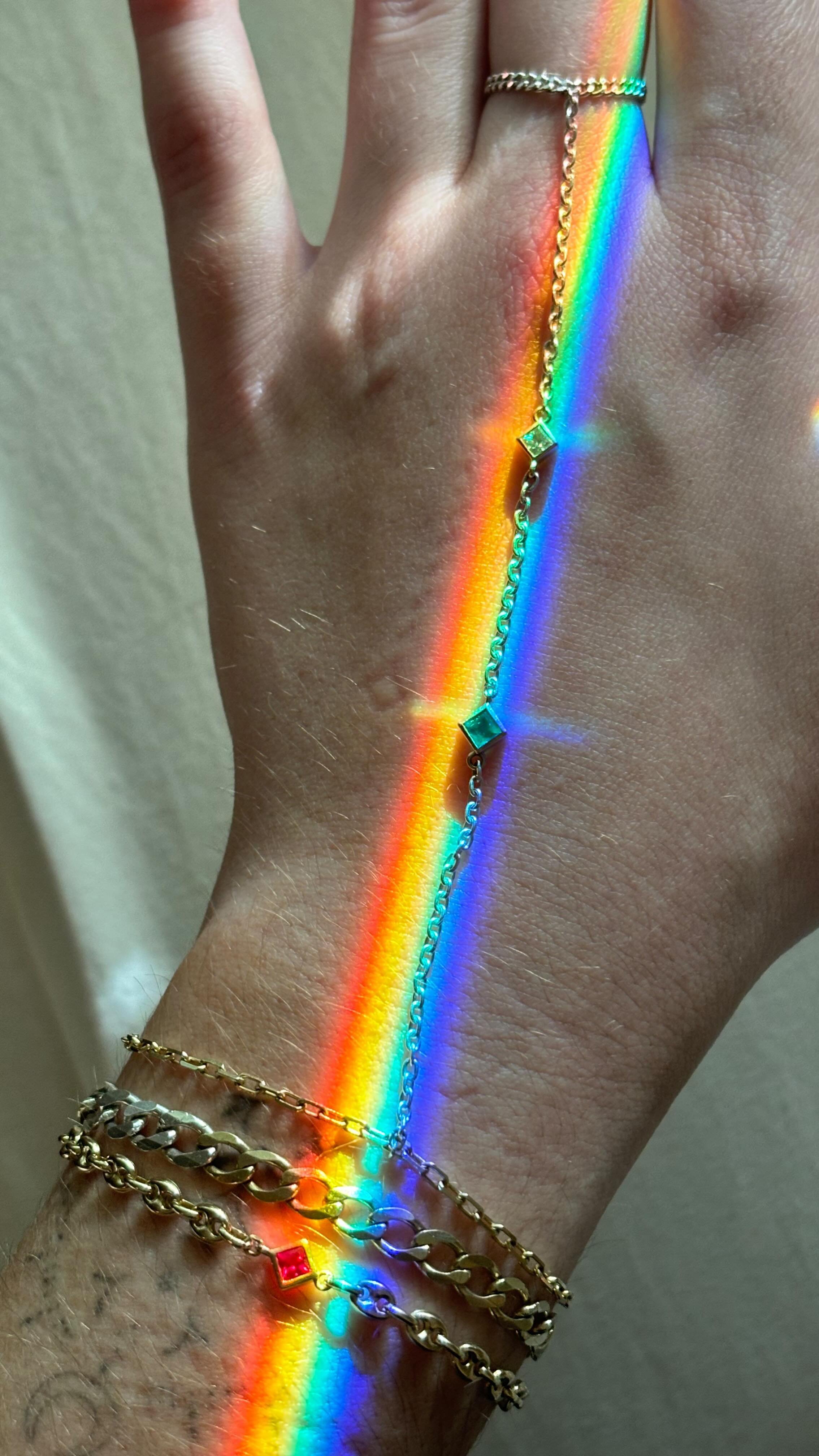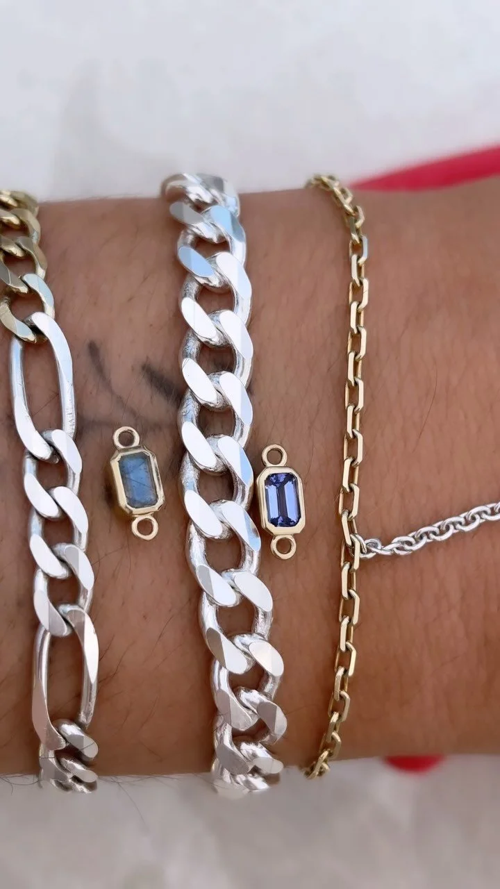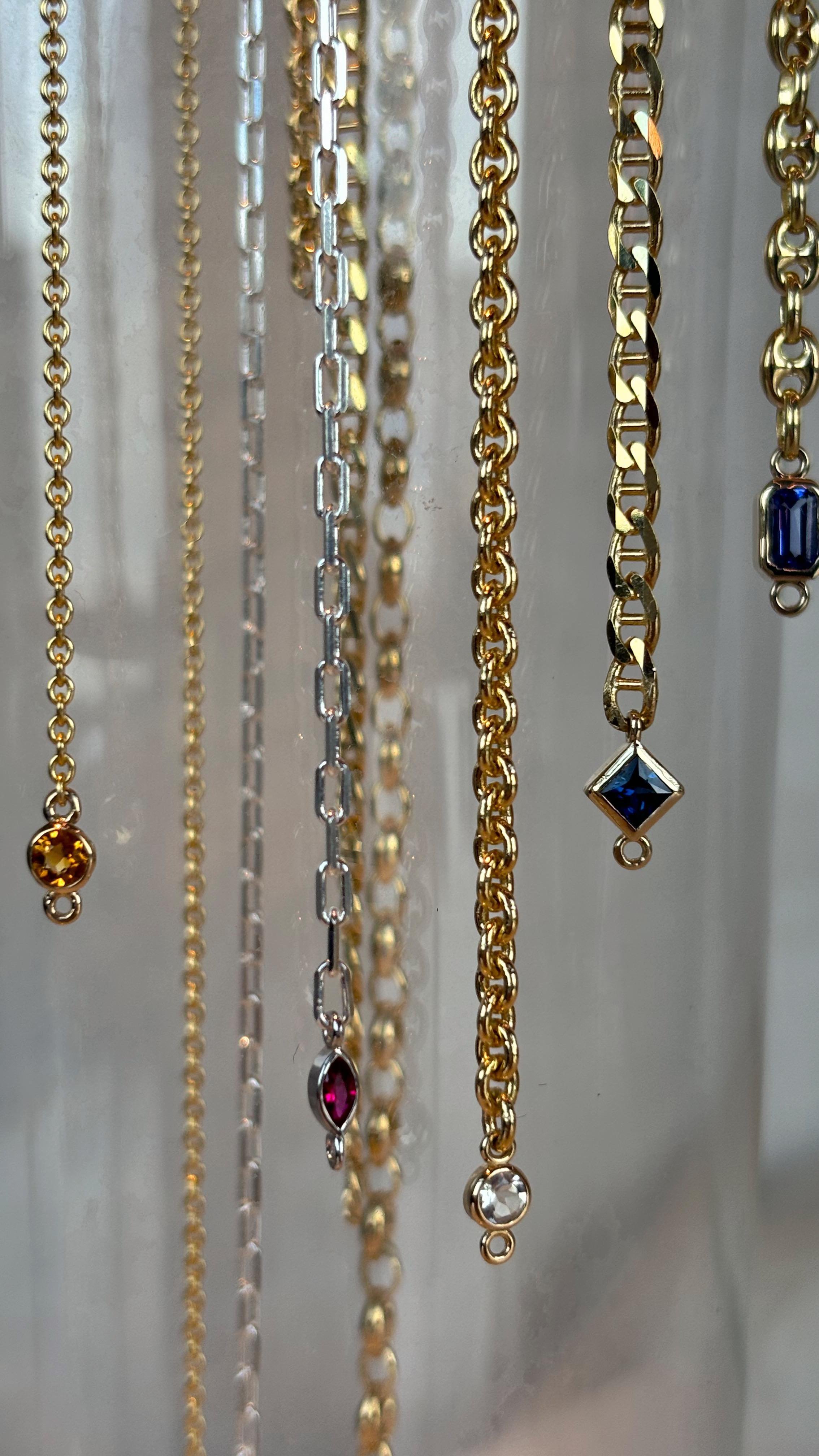 This also leaves you the option of combining as many chain styles as you would want into one piece, creating something completely one of a kind and custom to YOU on the spot. Adding in our genuine gemstones furthers your expression of the jewelry, welcoming gem healing and intention. You have the option of adding in gemstones in overtime, allowing the jewelry to evolve with you through life’s special moments.